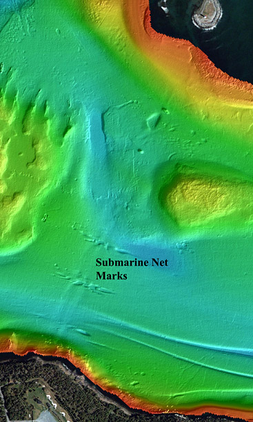 A multibeam bathymetric image of the seabed of Halifax Harbour in an area where anti submarine nets were positioned during World War II. Slight depressions occur on the seabed beneath where the nets crossed the Harbour. Larger depressions are the result of current scour around concrete weights used to hold the nets in place.